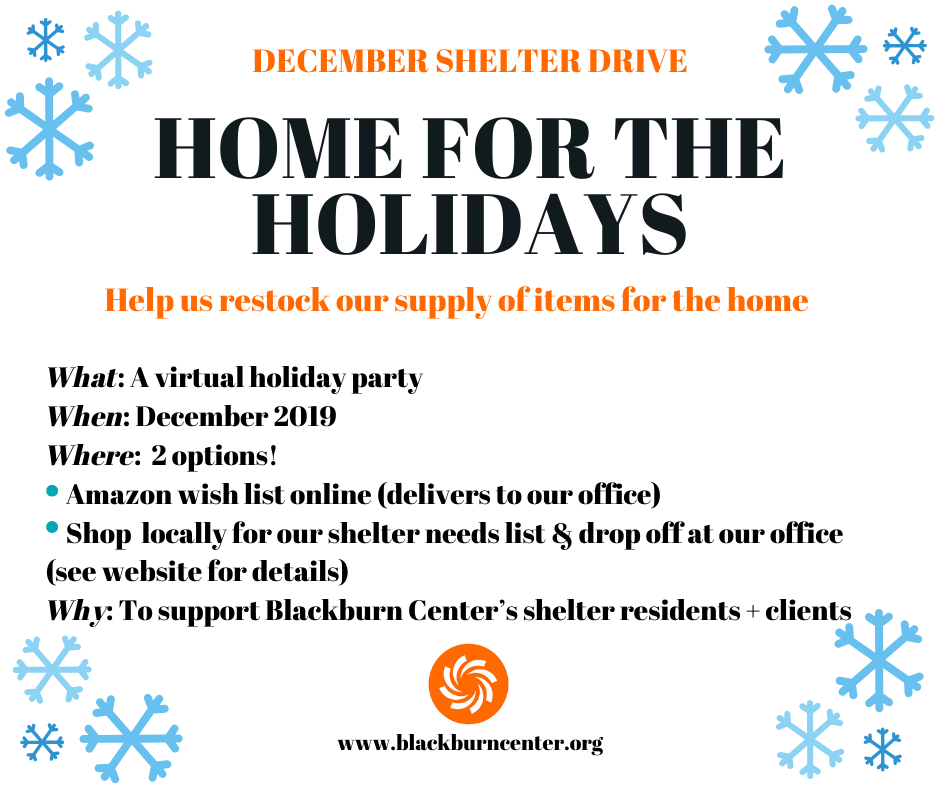 We cordially invite you to our virtual “Home for the Holidays” party, with a goal of gathering items for our shelter residents and clients that make a house a home. The items that we especially need include: